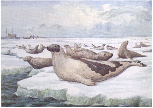 In the North Atlantic are to be found about six varieties of seals, the most valuable variety commercially being the harp-seal. The young harps76 begin to put on fat from the moment of their birth, so that in less than a month one of these baby seals will weigh from 25 to 40 pounds. They usually remain on the ice about twenty-five days before taking to the water, during which time they are fed by their mothers, who will sometimes travel ten miles in order to furnish their young with food. One of the most mysterious things, however, is that, even if the young are not fed by their mothers, they continue to put on fat. It may be that the old seals select a sheet of ice containing animalculæ, for the young are often observed to be sucking the ice in the absence of their mothers.