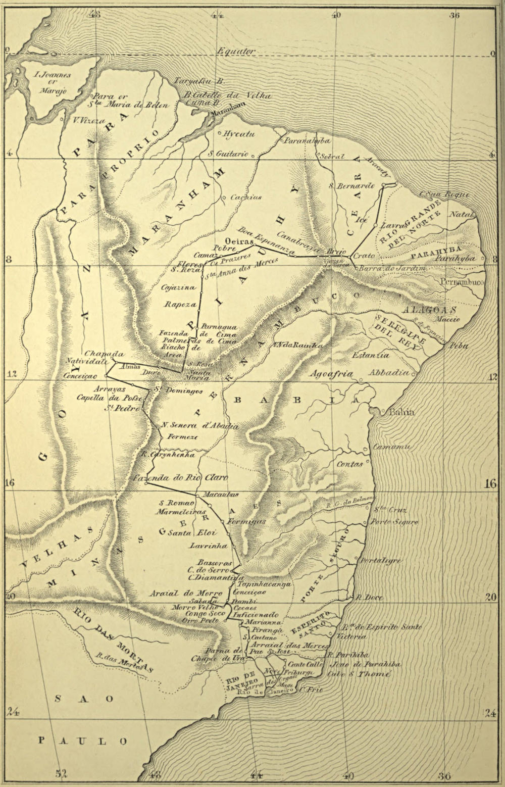 | The Author’s reception by the President of Piauhy—City of Oeiras described—Its Population—Its Trade with the Coast—Great want of River Navigation—Its chief exports are hides and cattle—Its Climate—Diseases—Character of the Barão de Parnahiba—His great power in the Province—History of this remarkable Man—And of the Civil War on declaration of the Independence of Brazil—Resources of the Province—National Cattle Farms—Course of the Author’s journey quite changed by an alarming Revolt—This insurrection described—He determines on travelling southwards through Goyaz and Minas Geräes—Leaves Oeiras—Description of the Country—Chapadas—Passes through many Cattle Farms—Curious mode of catching Cattle—Passes Pombas—Algodoes—Golfes—Retiro Alegre—Genipapo—Canavieira—Urusuhy—Prazeres—Description of a Piauhy Family—Reaches Flores—Rapoza—Arrives at Parnaguá—Universal Hospitality of the Natives—Salt found in the Neighbourhood | 193 |