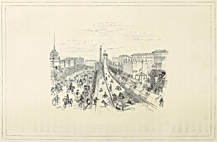 | Appearance of the capital—The public buildings—The statue of Peter—The quays—The lighting of the streets—The shops and shopmen—A bargain—The dwornicks: their wretched life—Tea-taverns: the company assembled—The itinerant merchants—Cossacks—Circassians: their fidelity—The soldiers of the line—Shameful treatment—The butitchnick—A sad occurrence—Winter aspect—The Nevsky Perspective—Costumes—A drowning man—Police regulations—Number of murders—A poor man’s funeral—Funeral cortège of a prince—Effect of twilight—Convicts—The metropolitan—The Emperor—Police regulations on salutations—The Kazane church | 51 |