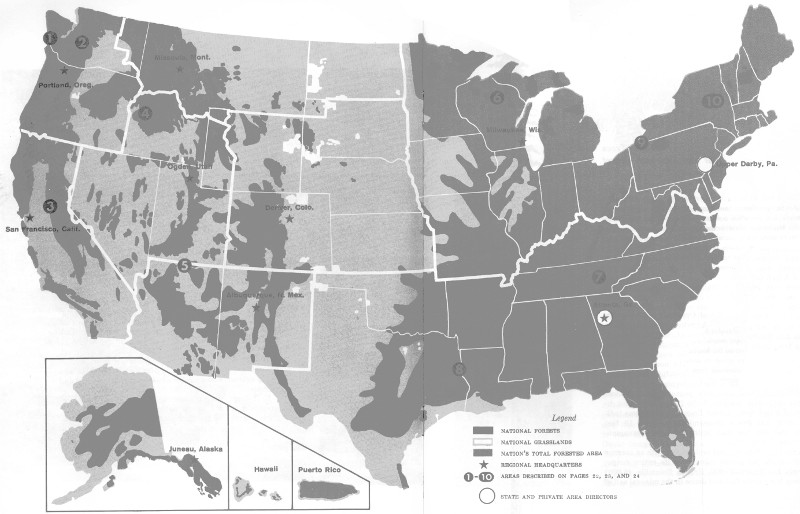 For detailed information on visiting the National Forests, see the map for the headquarters of the Forest Service Region administering the areas you are interested in and write to the appropriate Regional Forester, Forest Service:
