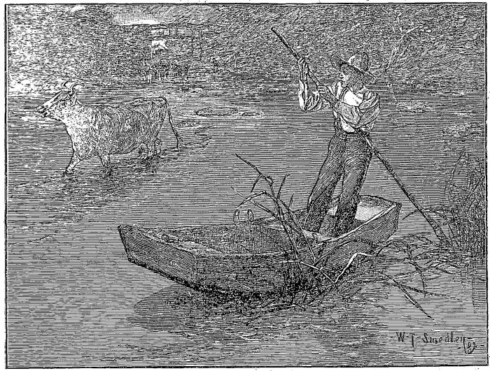 The cow seemed determined to dodge past that boat. The water ran very fast, and it was so shallow that even the punt ran aground every two minutes. It was by no means easy to push a boat in a swift current and drive a new cow at the same time.