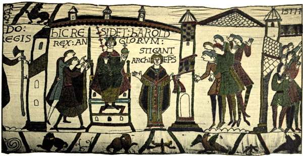 4. I have never understood why this third messenger should have been confused with Harold himself. The Latin inscription is quite clear: “Here they gave to Harold the Crown of King.” The people holding the axes are not Harold, neither is the man offering the crown, that I can see.