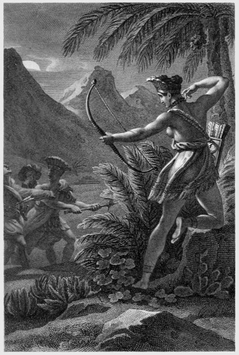 Colomb, à son retour, apprit leur mort: elle était juste; il aurait dû la pardonner: il la vengea par une perfidie. Il tendit un piége au cacique[7] qui avait délivré l'île de ces brigands, le fit prendre par trahison, le fit embarquer pour l'Espagne. Toute l'île se souleva; mais une multitude d'hommes nus, sans discipline et sans armes, ne put tenir contre des hommes vaillants, aguerris, bien armés: le plus grand nombre des Insulaires fut égorgé, le reste prit la fuite, ou subit le joug des vainqueurs. Ce fut là que Colomb apprit aux Espagnols à faire poursuivre et dévorer les Indiens par des chiens affamés, qu'on exerçait à cette chasse[8].