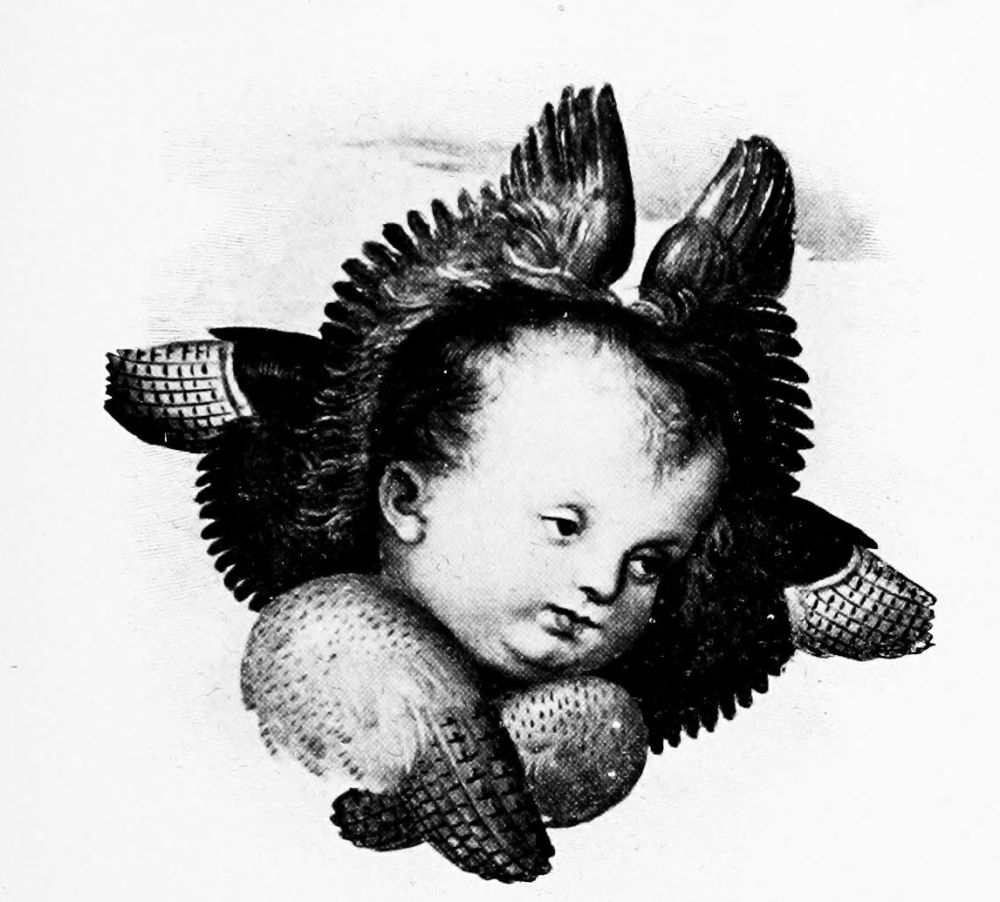 This manner of representing the two highest orders of angels is very ancient, and in the earliest instances in existence the faces are human, thoughtful, and mature. Gradually they became child-like, and were intended to express innocence, and later they degenerated into absurd little baby heads, with little wings folded under the chin. These in no sense convey the original, spiritual significance of the seraphic and cherubic head.