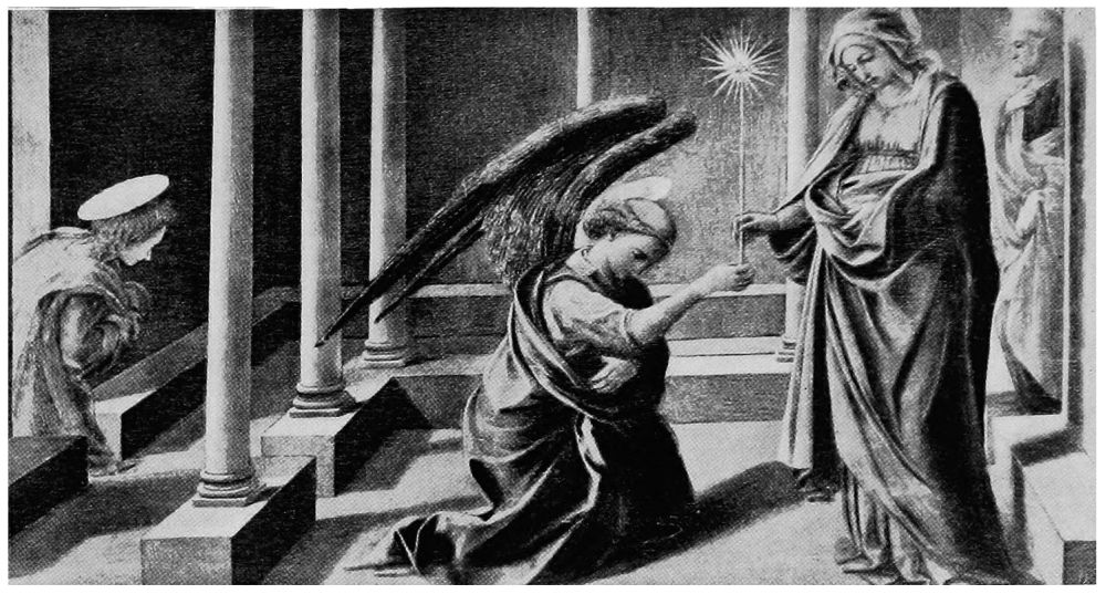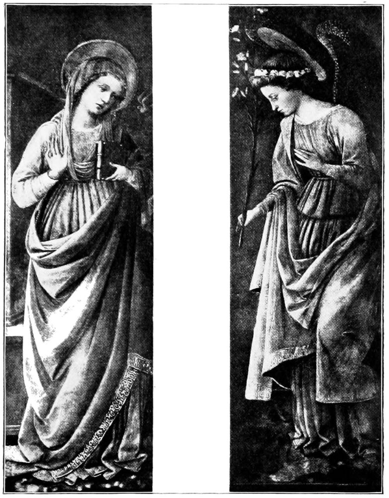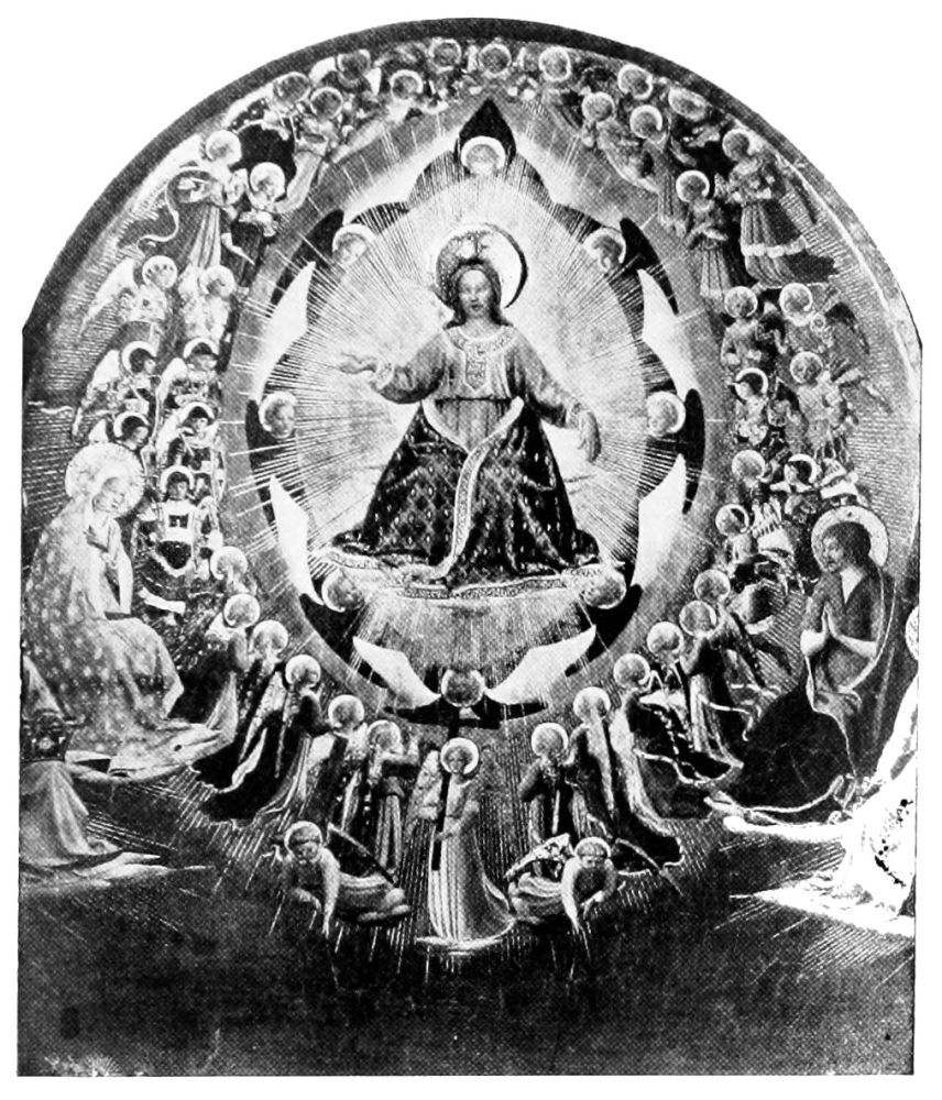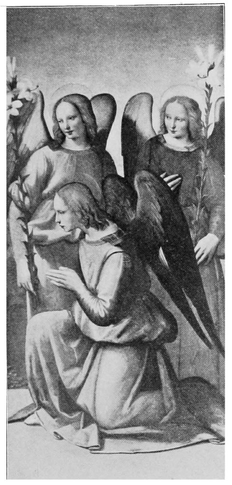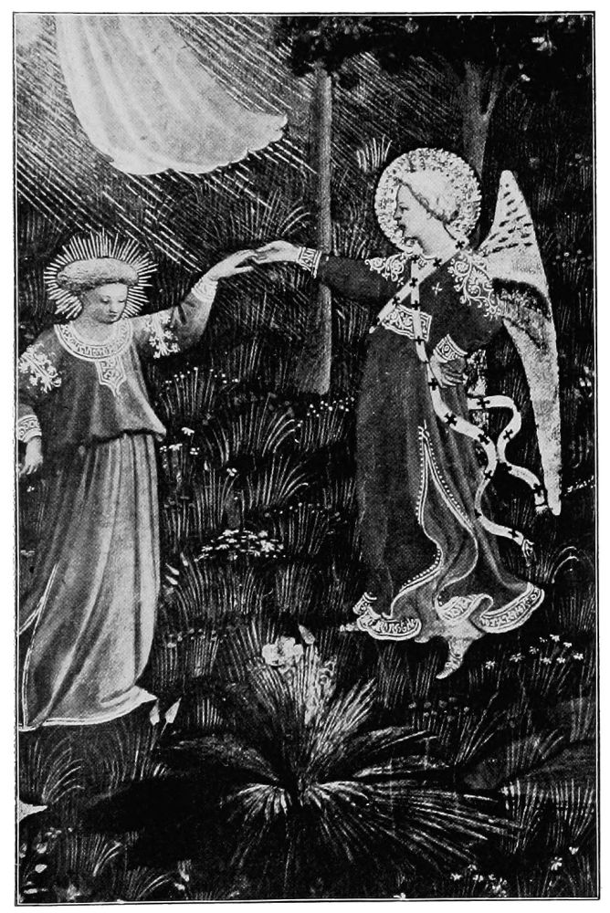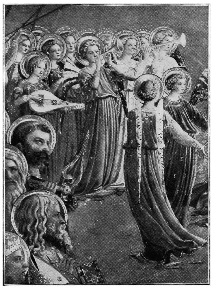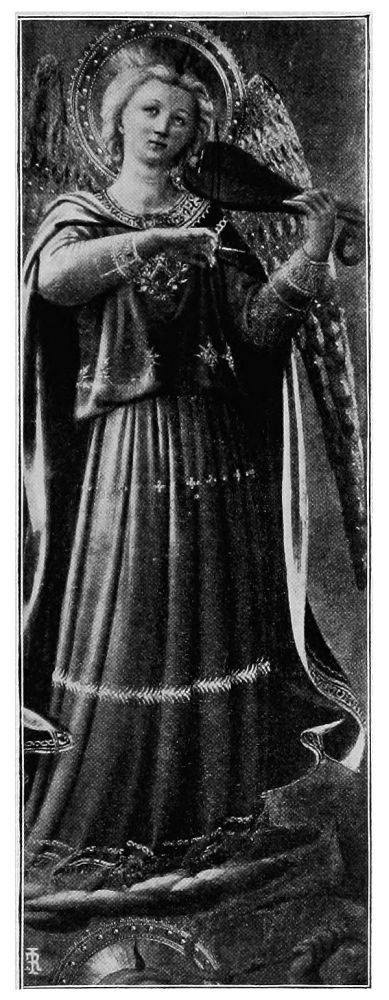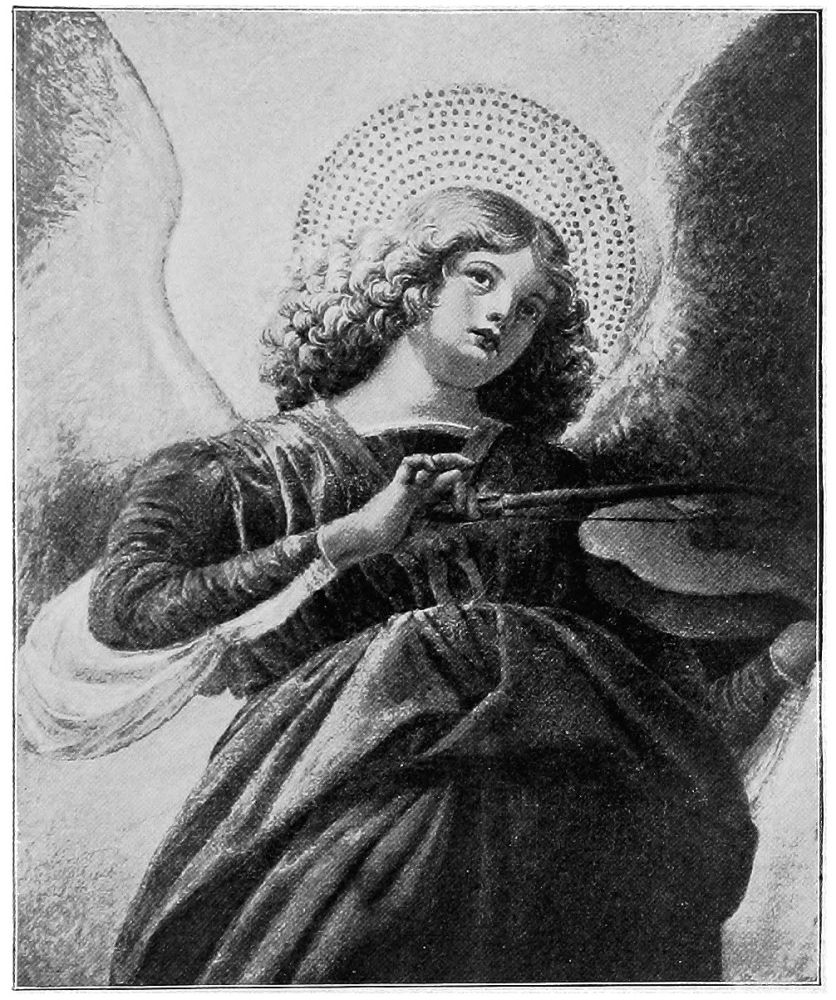 Giotto first approached the ideal representation of angels, and, naturally, his pupils excelled him in their conception{36} of what these celestial beings should be. It was, however, Angelico who first—and shall we not say last?—succeeded in portraying absolutely unearthly angels,—angels who must have appeared to him in his holy dreams, and impressed themselves on his pure spirit in such a wise that with mere paints and brushes he could picture a superhuman purity.