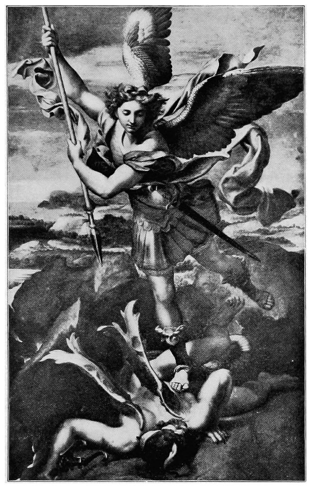 To whom, then, may one look for satisfactory angels? For myself, I answer, to Raphael, and especially to his later works. His angels are sexless, spiritual, graceful, and, at the same time, the personification of intelligence and power, as may be seen in our illustration of the Archangel Michael. Witness also the three angels in the Expulsion of Heliodorus from the Temple, in the Stanza della Signatura, in the Vatican. They are without wings, and none are needed to emphasize their godlike wrath against the thief who robbed the widow and orphan in the very temple of the Most High. The celestial warrior on his celestial steed,—believed to be St. Michael, in his office of Protector of the Hebrews,—the deadly{41} mace drawn back ready to strike the fallen robber, and his two rapidly gliding attendants, with streaming hair and swift, spirit-like movement, are such conceptions and personifications of superhuman power as can scarcely be paralleled in any other work of Art.