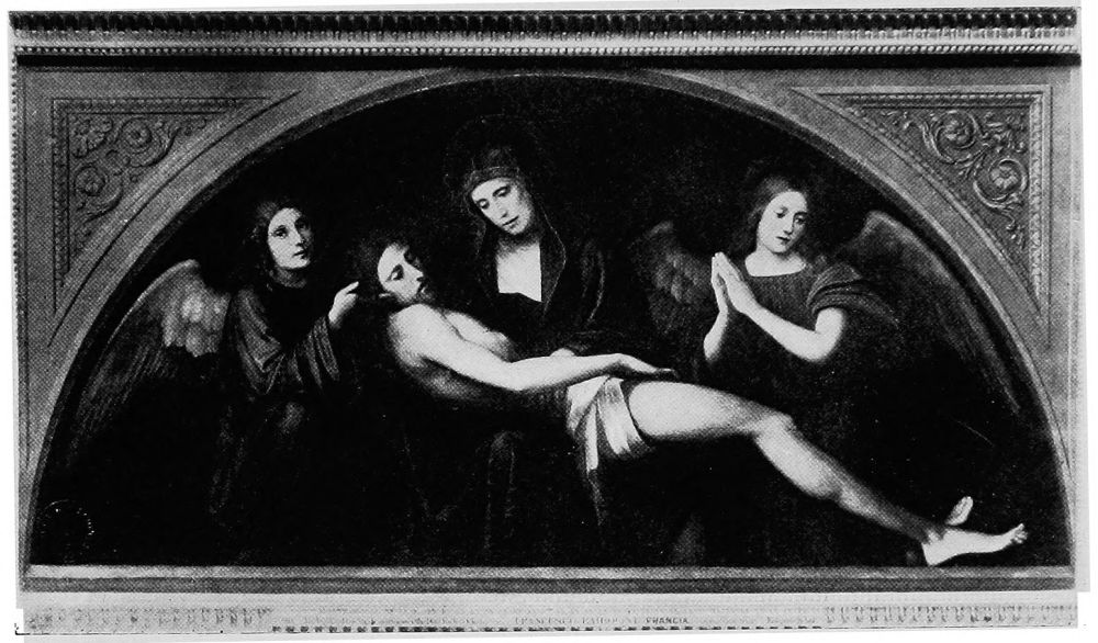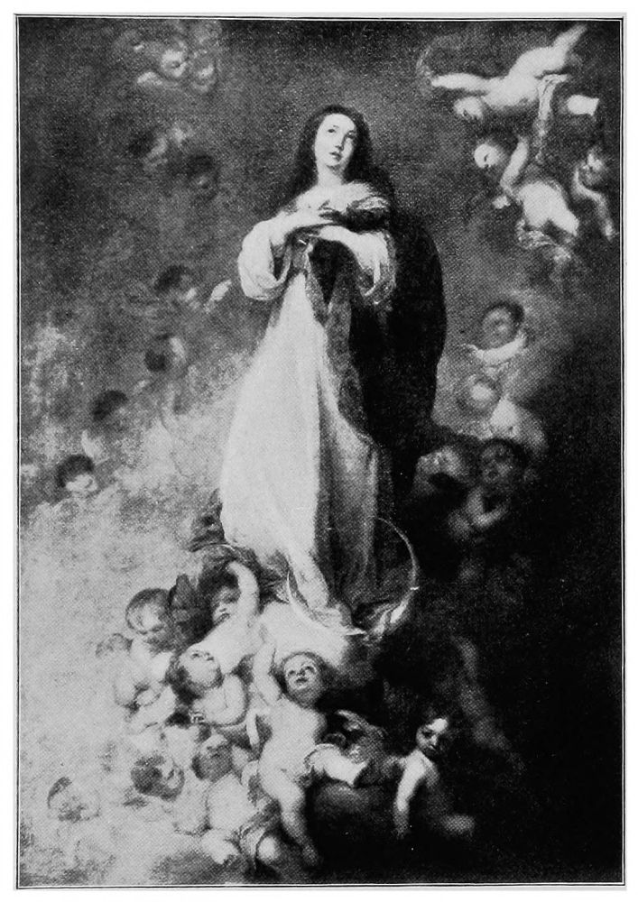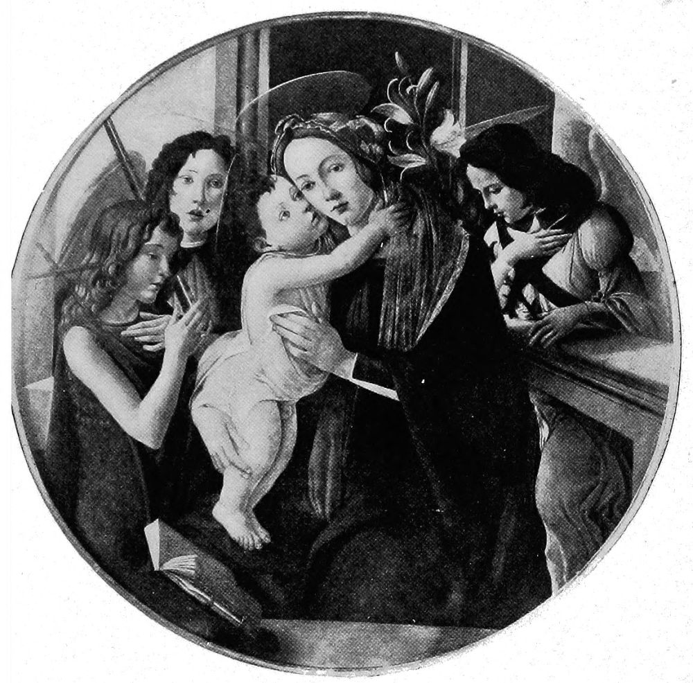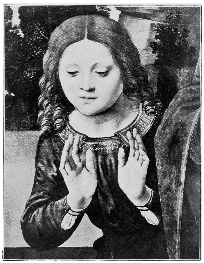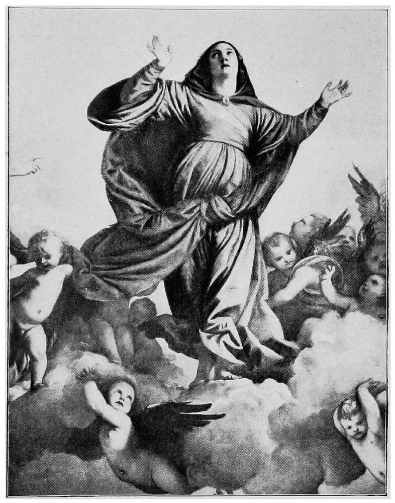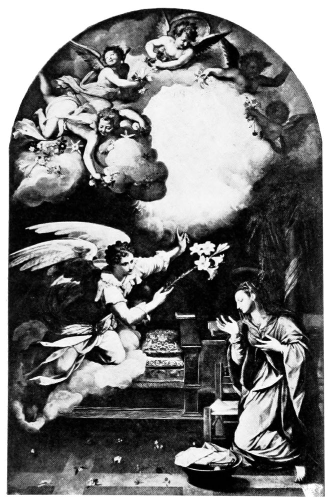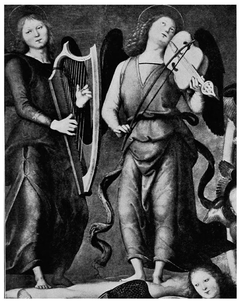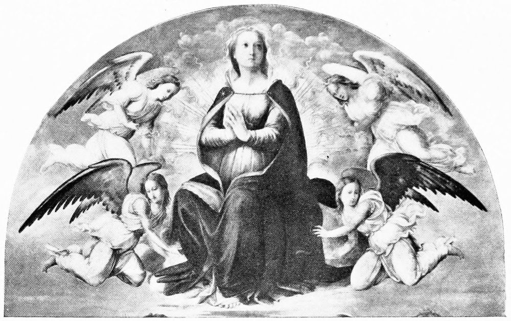 Two pictures of world-wide fame illustrate this change,—Raphael’s Madonna,{28} mentioned above, and Perugino’s Coronation of the Virgin. In the first, the entire background is composed of seraphs and cherubs apparently evolved from thin blue air, and in constant danger of disappearing in the golden-tinted background. In the second, the multi-colored wings of the floating cherubim are beautiful and the harmony of tones is exquisite, but they represent an innovation to which one must become more and more accustomed as artists are less reverent in their work.