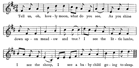"Can the moon see the lambs?" asked the child sleepily. His eyelids were so heavy that he could scarcely keep them open, while the moon looked in at the window and his mother sang:—