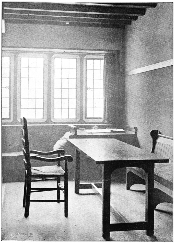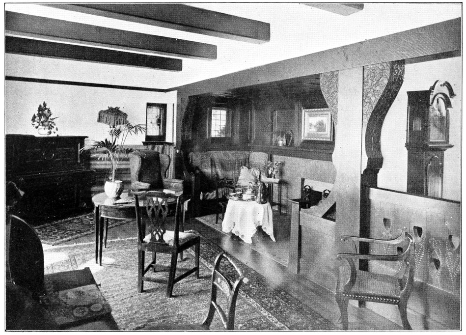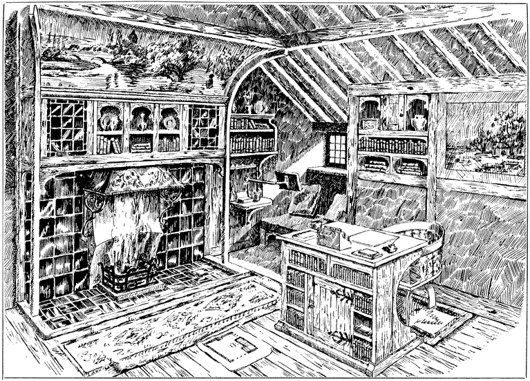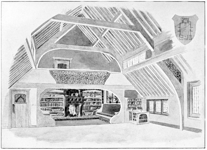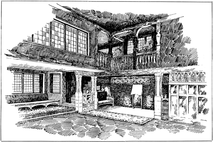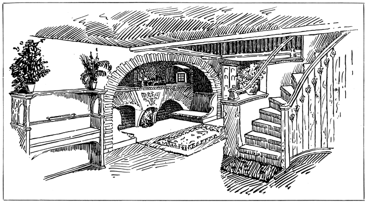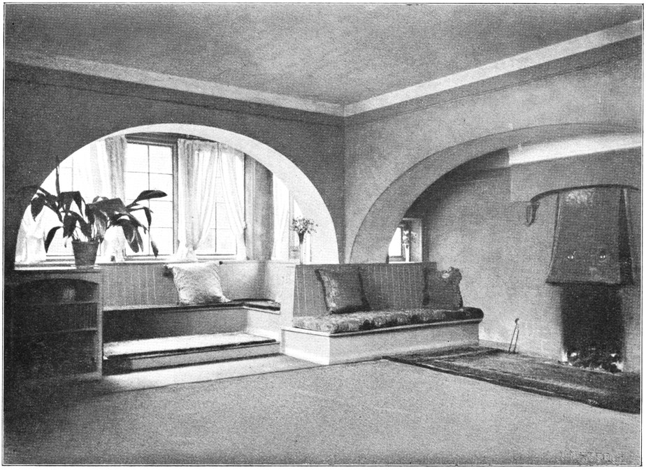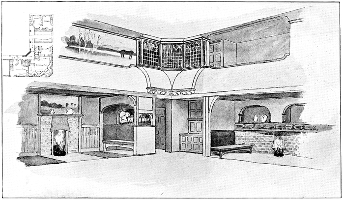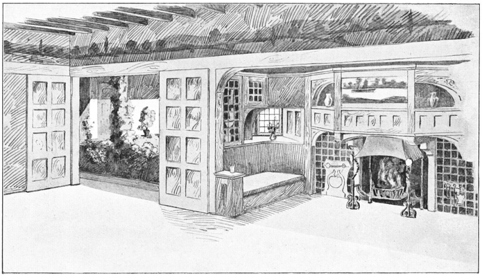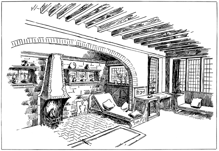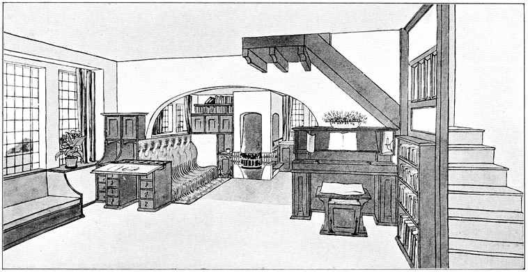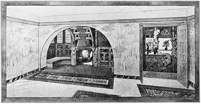 Now many people have a feeling that there is a certain cosiness in a small room entirely unattainable in a large one; this is a mistake altogether; quite the reverse has been my experience, which is that such a sense of cosiness as can be got in the recesses of a large room, can never be attained in a small one, be it no larger than a sentry box. But if your big room is to be comfortable it must have4 recesses. There is a great charm in a room broken up in plan, where that slight feeling of mystery is given to it which arises when you cannot see the whole room from any one point in which you are likely to sit; when there is always something round the corner.