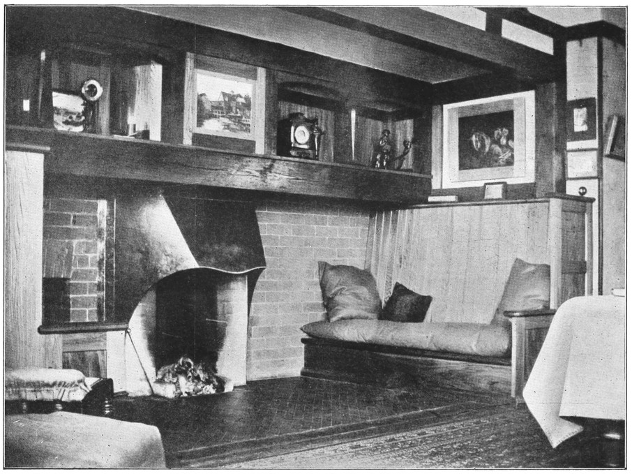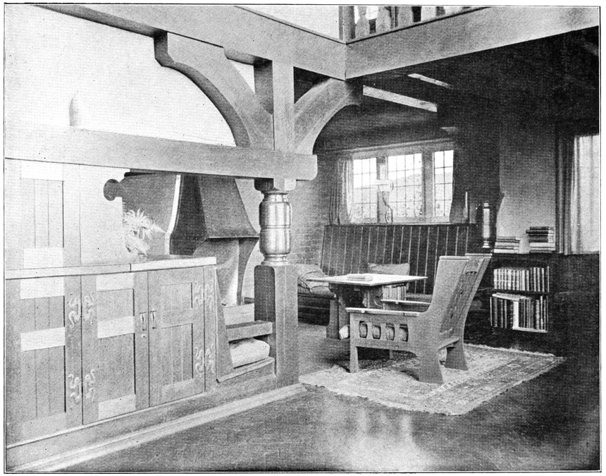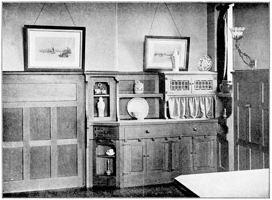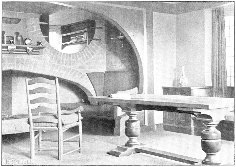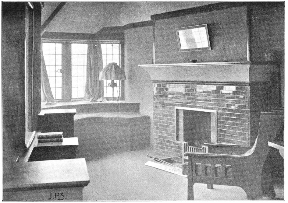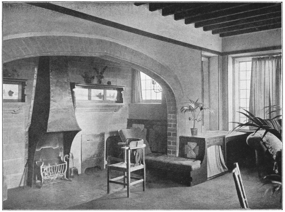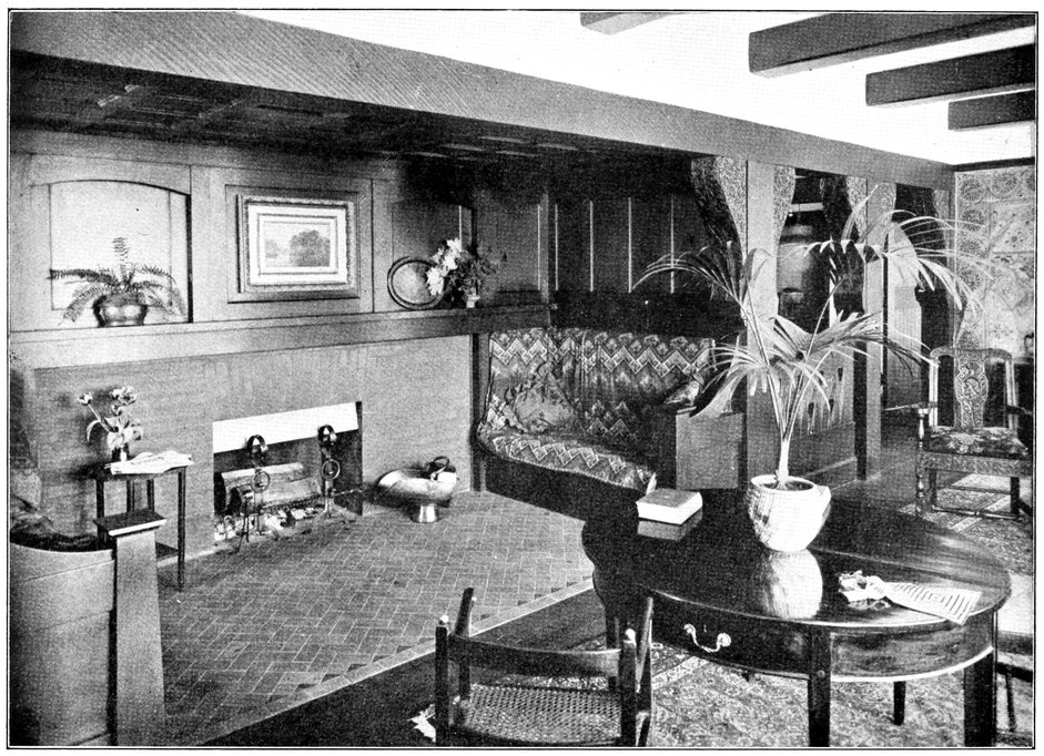 When the architect leaves the house, the subservience to convention is not over. After him follow the decorator and the furnisher, who try to overcome the lifelessness and vapidity by covering all surfaces with fugitive decorations and incongruous patterns, and filling the rooms with flimsyiv stereotyped furniture and nick-nacks. To these the mistress of the house will be incessantly adding, from an instinctive feeling of the incompleteness and unsatisfactoriness of the whole. Incidentally we see here one reason why the influence of the architect should not stop at the completion of the four walls, but should extend to the last detail of the furnished house. When his responsibility ceases with the erection of the shell, it is natural that he should look very little beyond this. There is no inducement for him to work out any definite scheme for a finished room, for he knows that if he had any aim the decorator and furnisher would certainly miss it and would fail to complete his creation. If, when designing a house, the architect were bearing in mind the effect each room would have when finished and furnished, his conceptions would be influenced from the very beginning, and his attitude towards the work would tend to undergo an entire change. At present he but too readily accepts the popular idea of art as a thing quite apart from life, a sort of trimming to be added if funds allow.