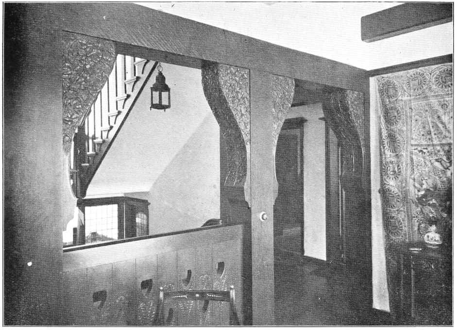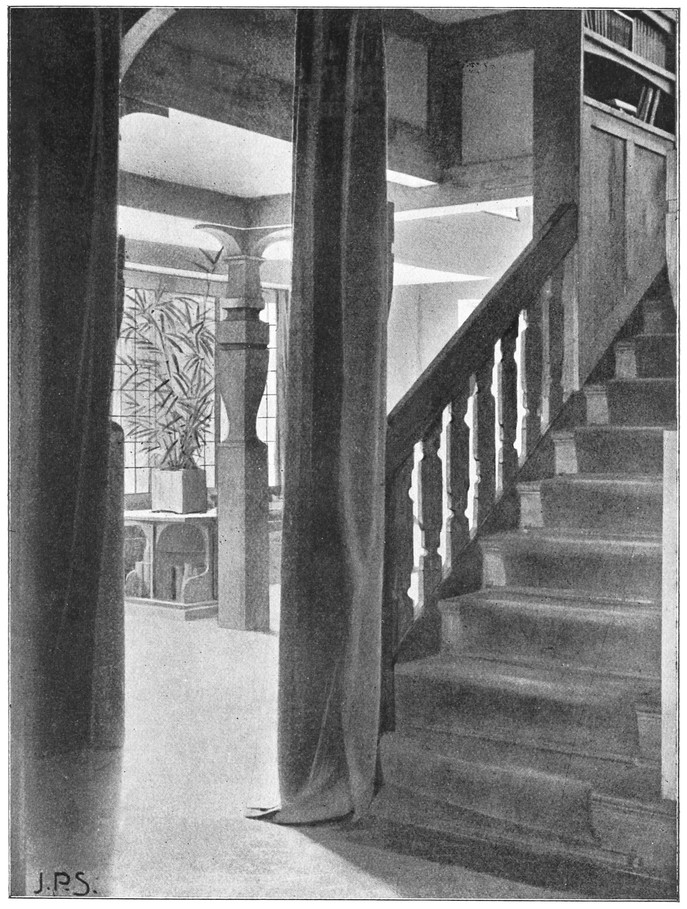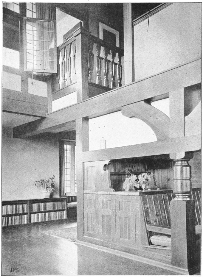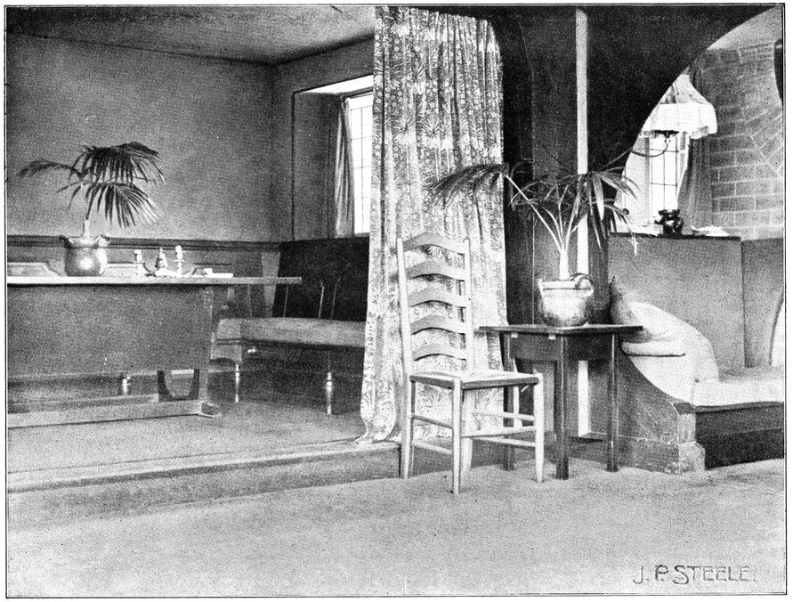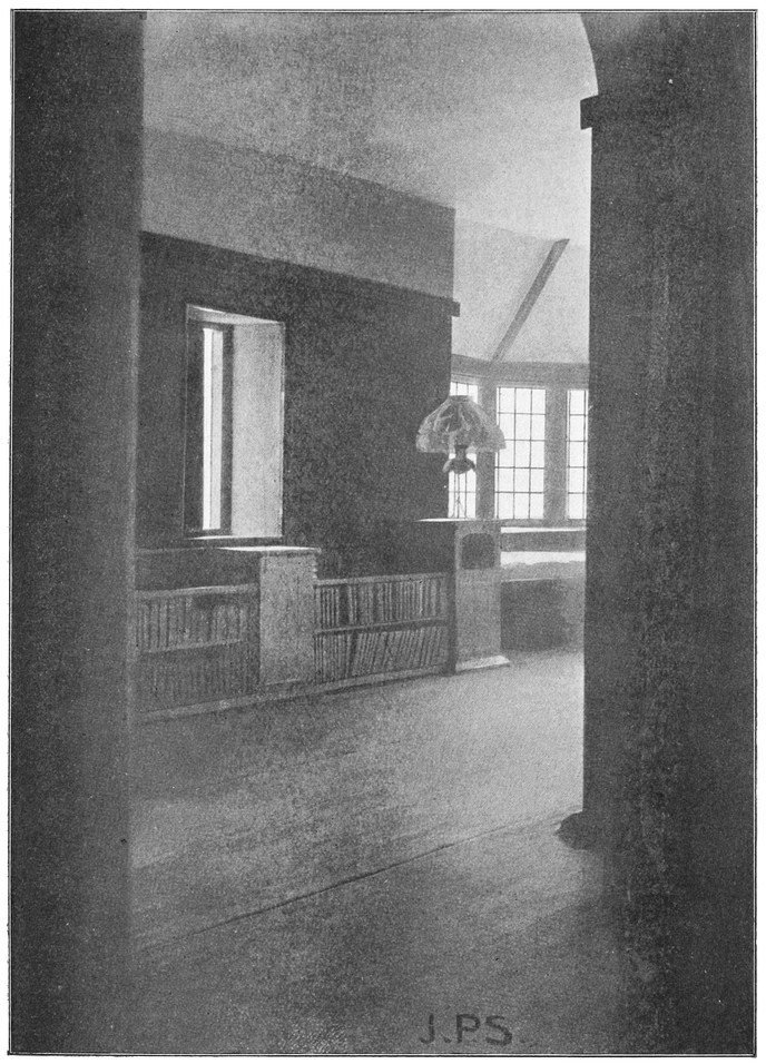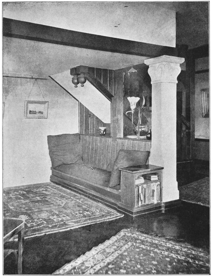 When the architect leaves the house, the subservience to convention is not over. After him follow the decorator and the furnisher, who try to overcome the lifelessness and vapidity by covering all surfaces with fugitive decorations and incongruous patterns, and filling the rooms with flimsyiv stereotyped furniture and nick-nacks. To these the mistress of the house will be incessantly adding, from an instinctive feeling of the incompleteness and unsatisfactoriness of the whole. Incidentally we see here one reason why the influence of the architect should not stop at the completion of the four walls, but should extend to the last detail of the furnished house. When his responsibility ceases with the erection of the shell, it is natural that he should look very little beyond this. There is no inducement for him to work out any definite scheme for a finished room, for he knows that if he had any aim the decorator and furnisher would certainly miss it and would fail to complete his creation. If, when designing a house, the architect were bearing in mind the effect each room would have when finished and furnished, his conceptions would be influenced from the very beginning, and his attitude towards the work would tend to undergo an entire change. At present he but too readily accepts the popular idea of art as a thing quite apart from life, a sort of trimming to be added if funds allow.