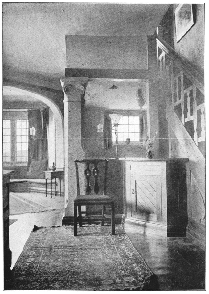Of course a hall of this kind needs some care in planning. In the first place, the staircase must occupy exactly that position in which it can be made an ornament and a pleasing feature in the room, all of which it is quite capable of being, and a position in which it does not detract from the cosiness, or give any unpleasant feeling of draughtiness, or too great openness. In the second place, the doors necessarily opening into a hall must be carefully so grouped that the parts of the room in which anyone would sit, shall be out of the draught of them as far as possible.