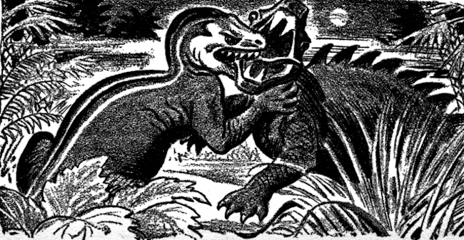 Beyond the mountains lay a dead sea bottom. It stretched away under the moonlight, dropping, always dropping, until at last it became only a vast pit of darkness. Ribs of chalk and coral gleamed here and there, pushing through the lichens like bones through the dried skin of a man long dead.