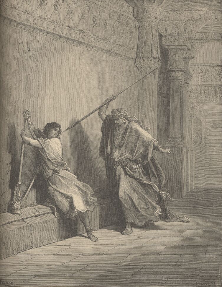 And it came to pass on the morrow, that the evil spirit from God came upon Saul, and he prophesied in the midst of the house: and David played with his hand, as at other times: and there was a javelin in Saul's hand. And Saul cast the javelin; for he said, I will smite David even to the wall with it. And David avoided out of his presence twice.—1 Samuel xviii, I-II.