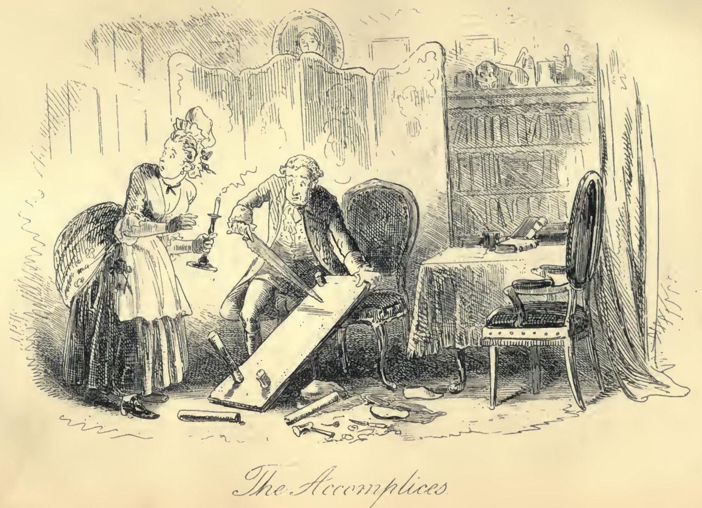 The stillness consequent on the cessation of the rumbling and labouring of the coach, added to the stillness of the night, made it very quiet indeed. The panting of the horses communicated a tremulous motion to the coach, as if it were in a state of agitation. The hearts of the passengers beat loud enough perhaps to be heard; but at any rate, the quiet pause was audibly expressive of people out of breath, and holding the breath, and having the pulses quickened by expectation.