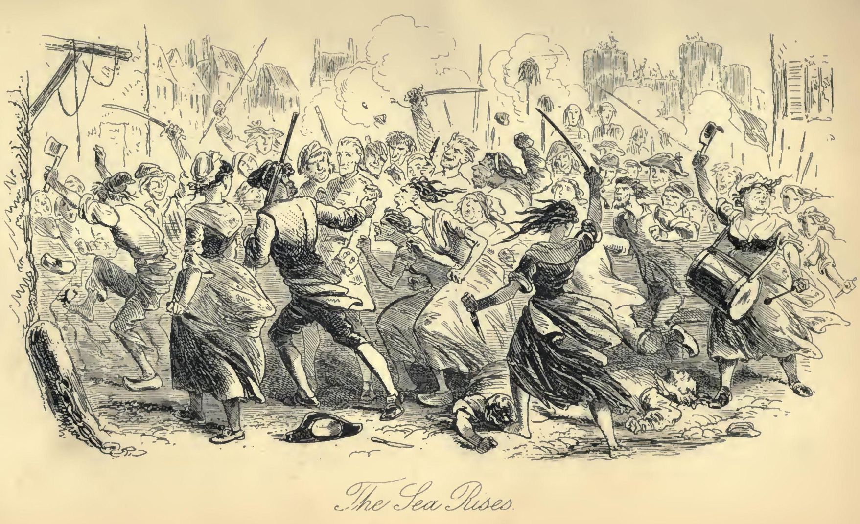 All these things, and a thousand like them, came to pass in and close upon the dear old year one thousand seven hundred and seventy-five. Environed by them, while the Woodman and the Farmer worked unheeded, those two of the large jaws, and those other two of the plain and the fair faces, trod with stir enough, and carried their divine rights with a high hand. Thus did the year one thousand seven hundred and seventy-five conduct their Greatnesses, and myriads of small creatures—the creatures of this chronicle among the rest—along the roads that lay before them.