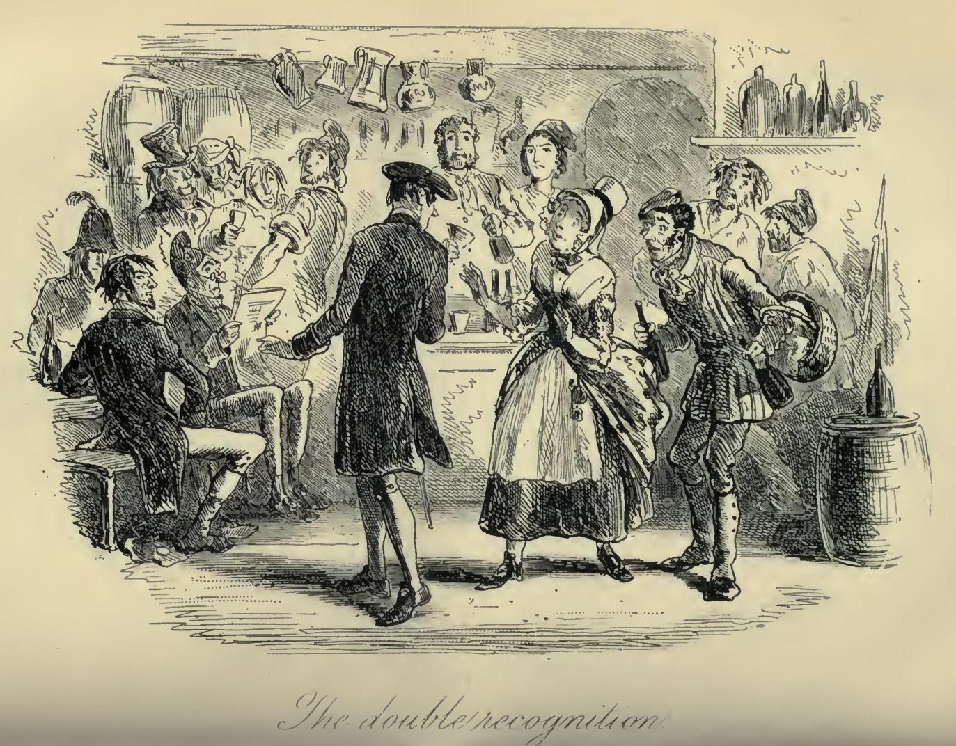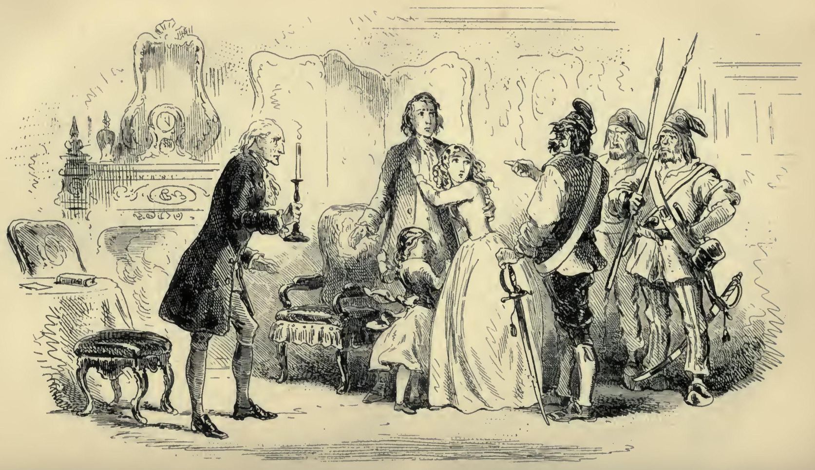 Two other passengers, besides the one, were plodding up the hill by the side of the mail. All three were wrapped to the cheekbones and over the ears, and wore jack-boots. Not one of the three could have said, from anything he saw, what either of the other two was like; and each was hidden under almost as many wrappers from the eyes of the mind, as from the eyes of the body, of his two companions. In those days, travellers were very shy of being confidential on a short notice, for anybody on the road might be a robber or in league with robbers. As to the latter, when every posting-house and ale-house could produce somebody in “the Captain's” pay, ranging from the landlord to the lowest stable non-descript, it was the likeliest thing upon the cards. So the guard of the Dover mail thought to himself, that Friday night in November, one thousand seven hundred and seventy-five, lumbering up Shooter's Hill, as he stood on his own particular perch behind the mail, beating his feet, and keeping an eye and a hand on the arm-chest before him, where a loaded blunderbuss lay at the top of six or eight loaded horse-pistols, deposited on a substratum of cutlass.