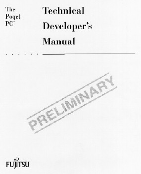 This is the original Poqet PC Technical Developer's Manual published by Fujitsu in 1992, but never widely released (that's why it still says "preliminary" on the cover). It is reproduced here in its entirety, including possible errors and omissions. The only page that I've left out is a page containing addresses of Fujitsu divisions around the world -- they are now out of date and incorrect, and I felt it better just to leave them out. If you need Fujitsu's address, it's in the FAQ.
